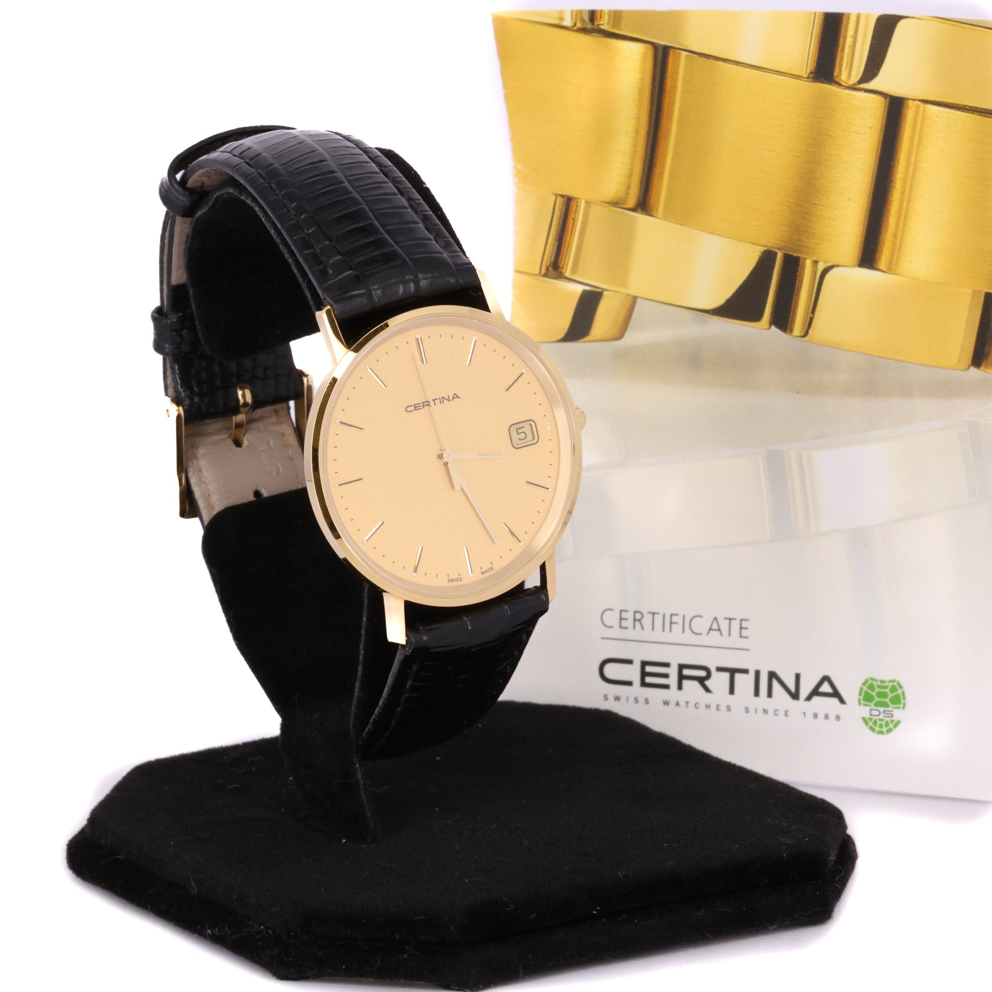 Miksi vain kertoa kellonaika, jolloin voit omistaa sen? Tämä Certinan miestenkello yhdistää 18 karaatin kultaisen eleganssin tyylikkääseen mustaan nahkarannekkeeseen, mikä yhdistää täydellisen tasapainon voiman ja kiillon välillä. Se ei vain tikitä – se puhuu. Ja se sanoo: ajatonta tyyliä, juuri aikataulussa.