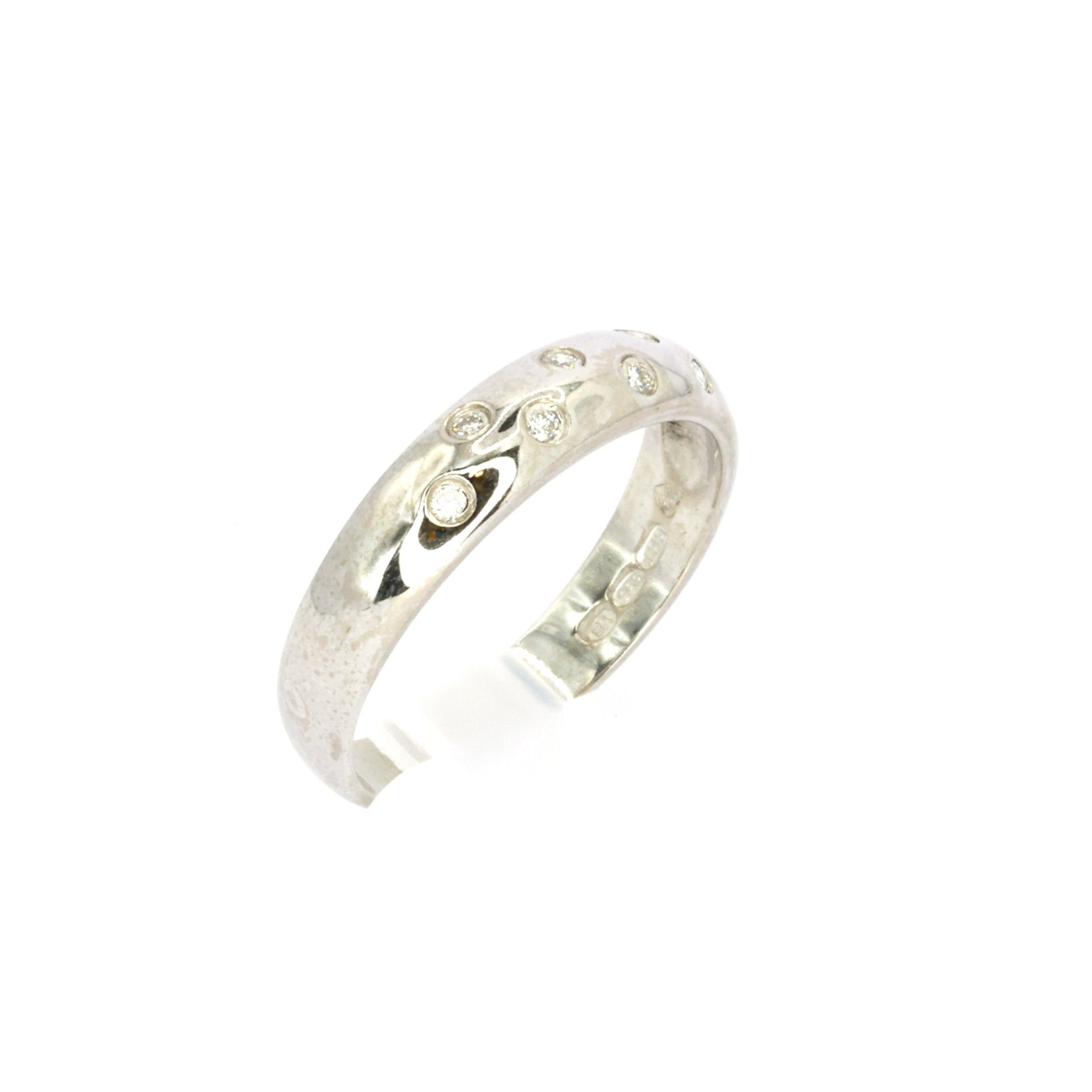 Tämä ei ole mikä tahansa sormus. Tämä on valkokultainen, rodiumilla päällystetty mestariteos , jossa on kahdeksan pientä timanttia, jotka näyttävät siltä kuin hieman humalassa oleva keiju olisi ripotellut ne niihin. Unohda täydellinen symmetria – tämä sormus on todiste siitä, että kaaos voi olla tyylikästä.