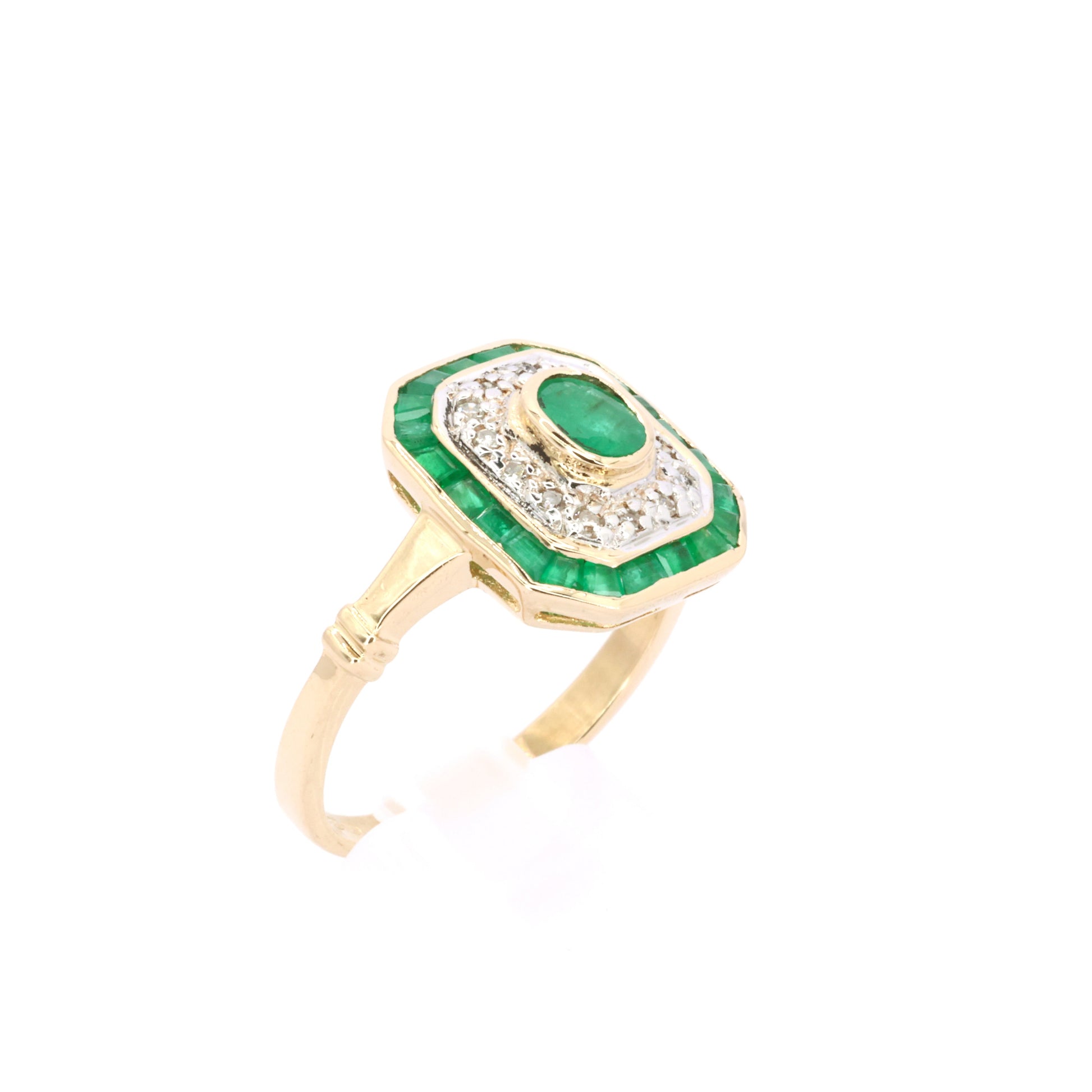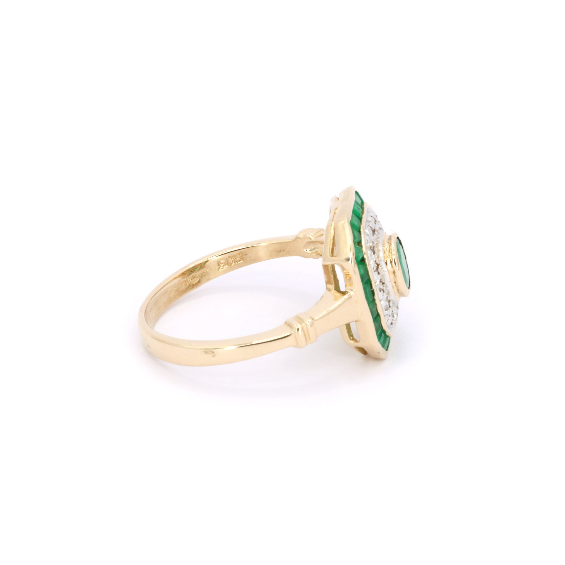 Suoraan 1920-luvun mölystä, tämä vintage rt deco -kultasormus tuo aitoa Gatsby-tunnelmaa – rohkeita linjoja, kimaltelevia timantteja ja upean smaragdinvihreän keskipisteen, joka vaatii huomiota.