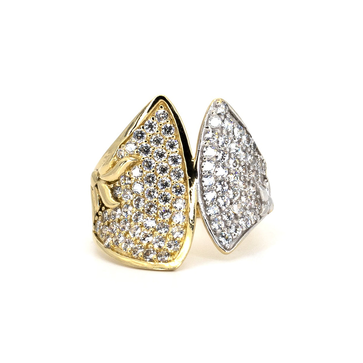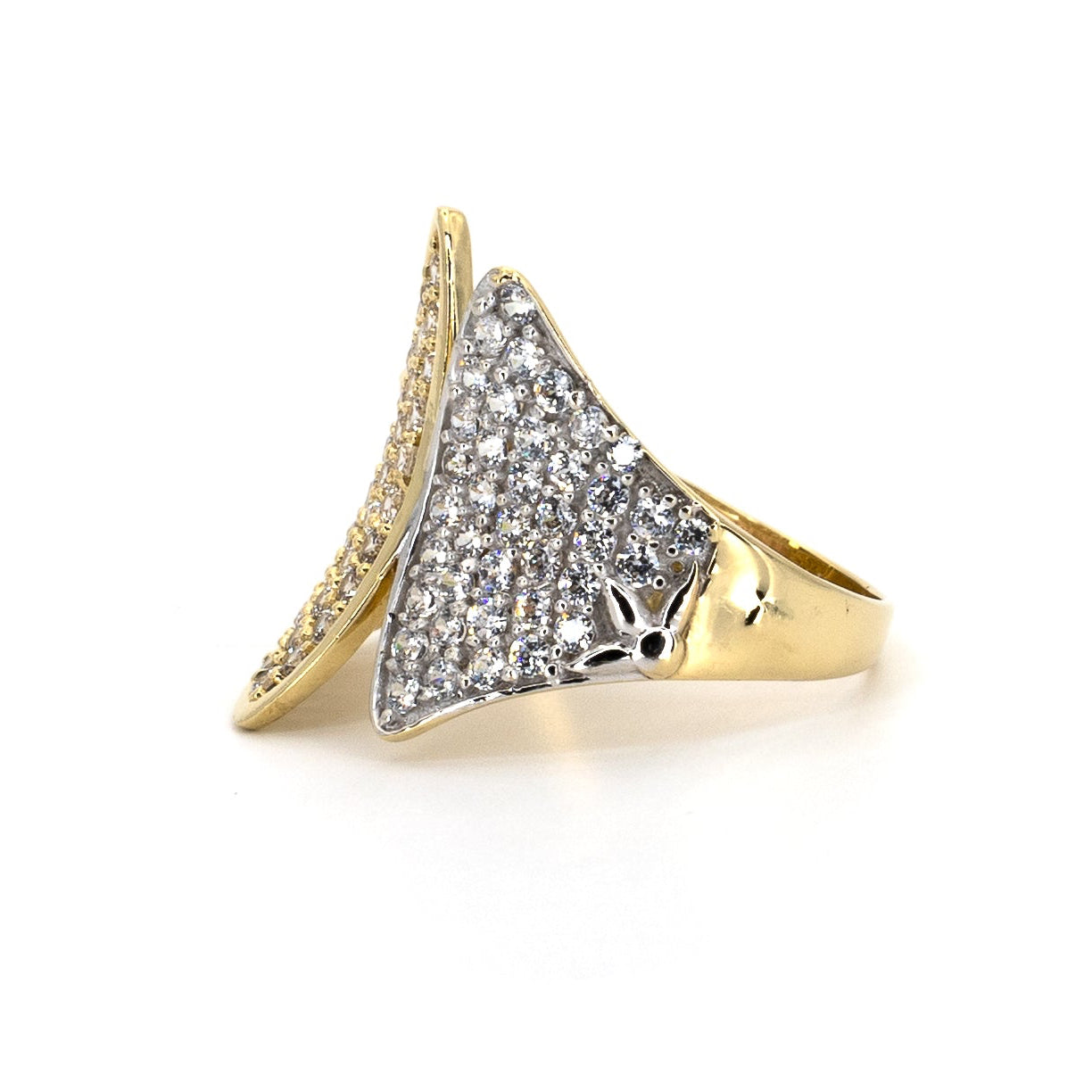 Tämä fantasiasormus leviää sormellasi kuin kaksi kultaista siipeä valmiina lentoon – rohkea, veistoksellinen ja mahdoton sivuuttaa. Se ei ole hienovarainen. Se ei kuiskaa. Se pyyhkäisee sisään, herättää huomiota ja jättää kaikki ihmettelemään, miten he ovat koskaan käyttäneet mitään pienempää.