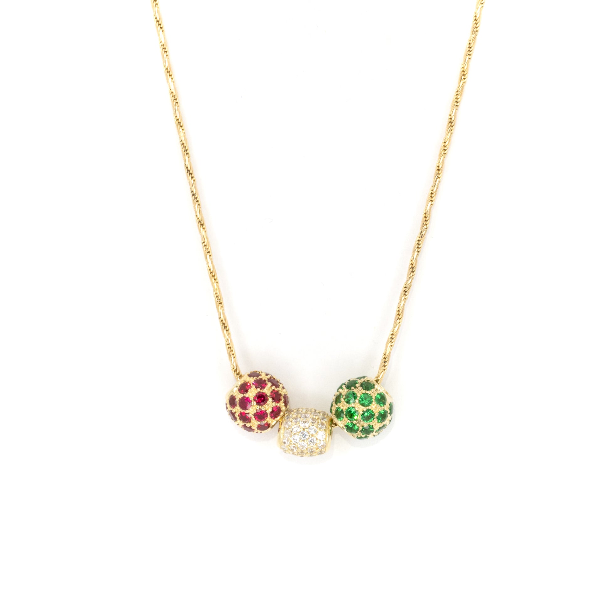 Kolme iloista pientä pyöreää riipusta, joista jokainen kimaltelee kuin olisi ryöstänyt joulupukin jalokivisäkin: yksi smaragdinvihreä, yksi iloisen punainen ja yksi häikäisevän kaunis kuutiollinen zirkonia. Täydellinen lisäämään ripauksen joulumieltä... tai vain teeskentelemään, että jokainen päivä on juhla.