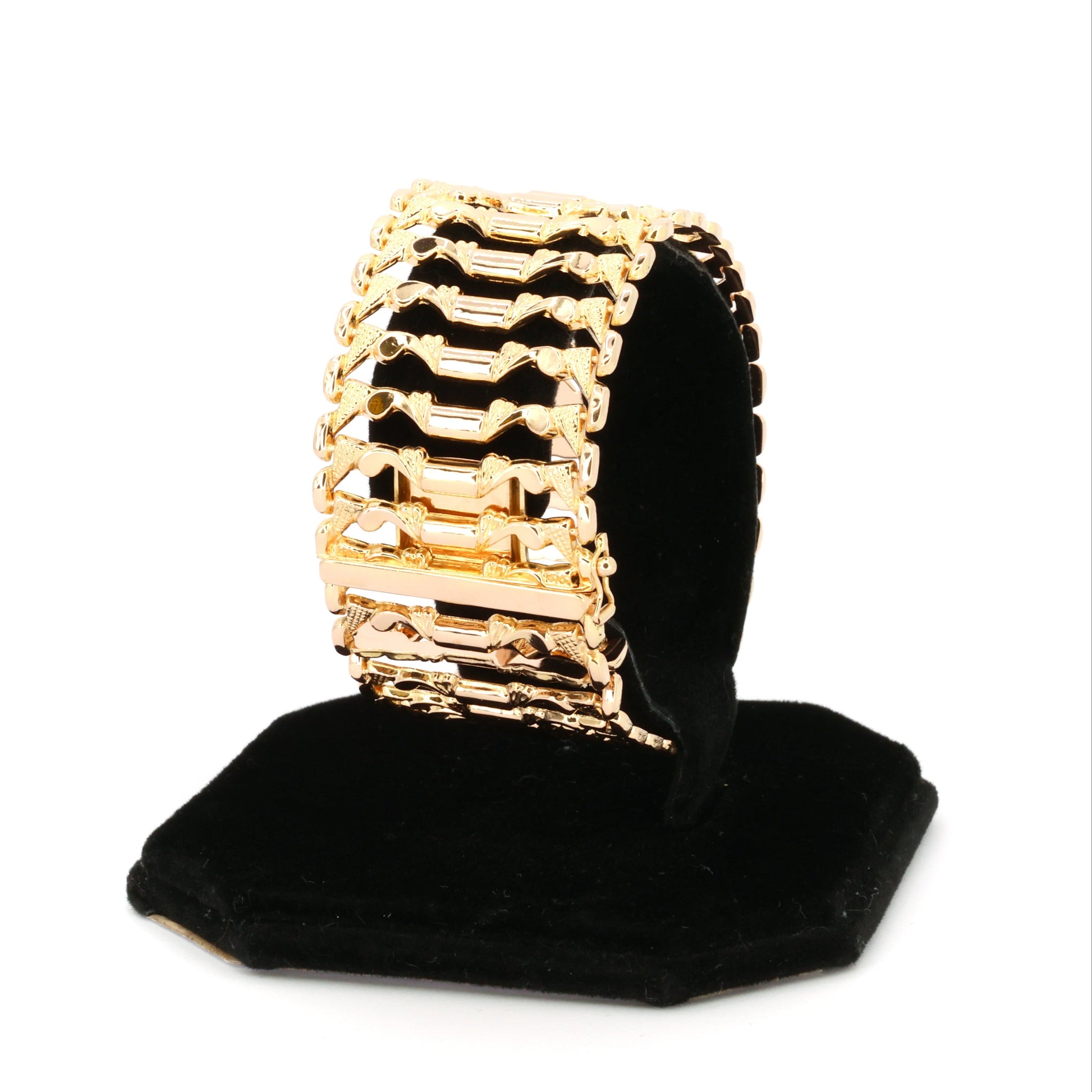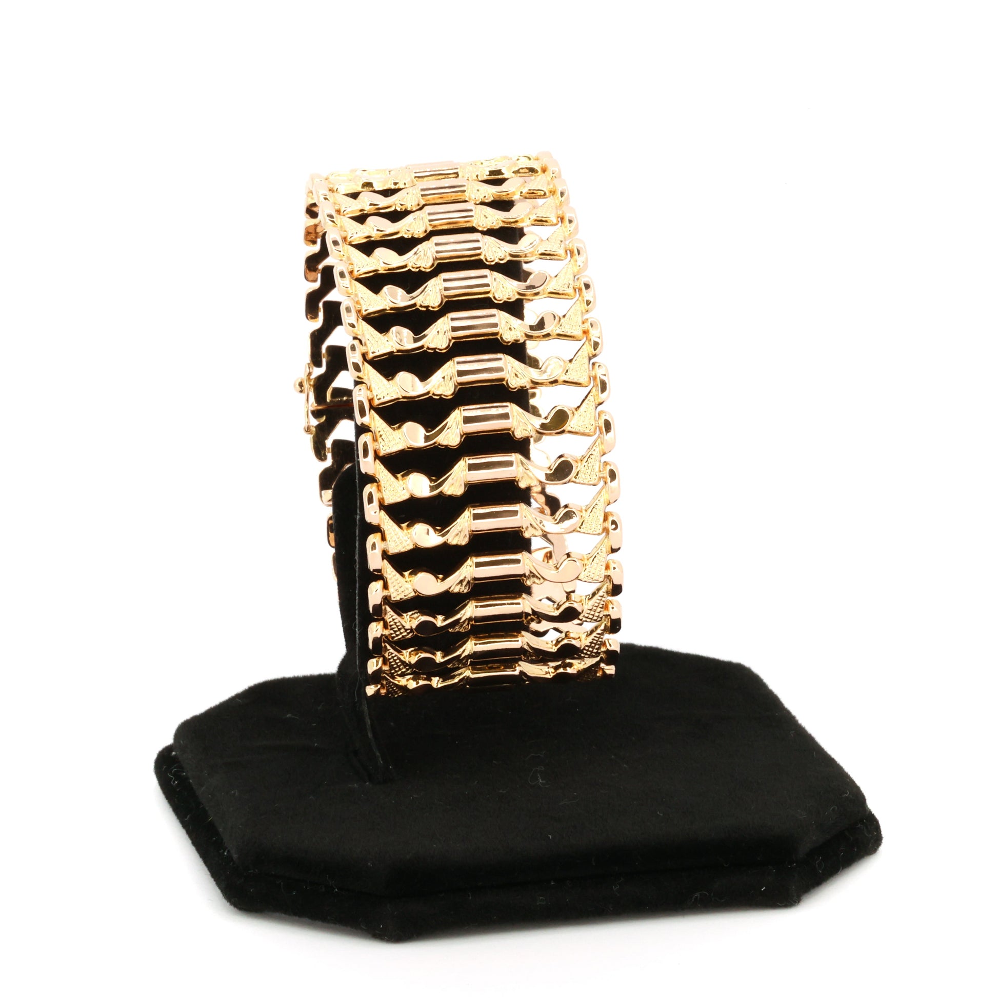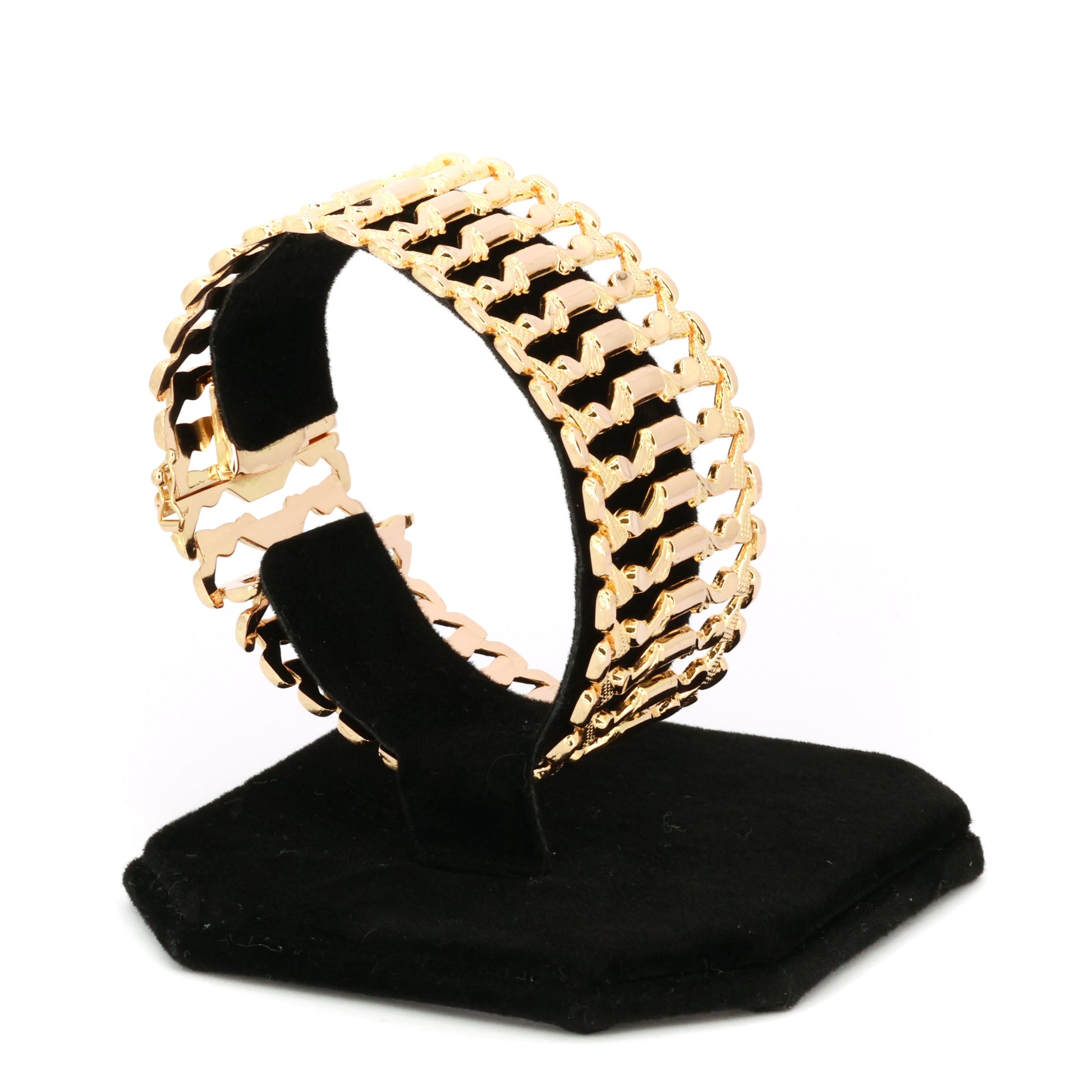 Tapaa ranneke, joka ei vain istu paikallaan – se vierii tyylikilpailijoidesi yli. Yli 3 cm paksu, täyskultaa, jykevä ja rohkea, ja sen muotoilu kuiskaa "tankinpyörät" ja huutaa "pysäyttämätön". Ei herkkähermoisille... tai rannekevyille.