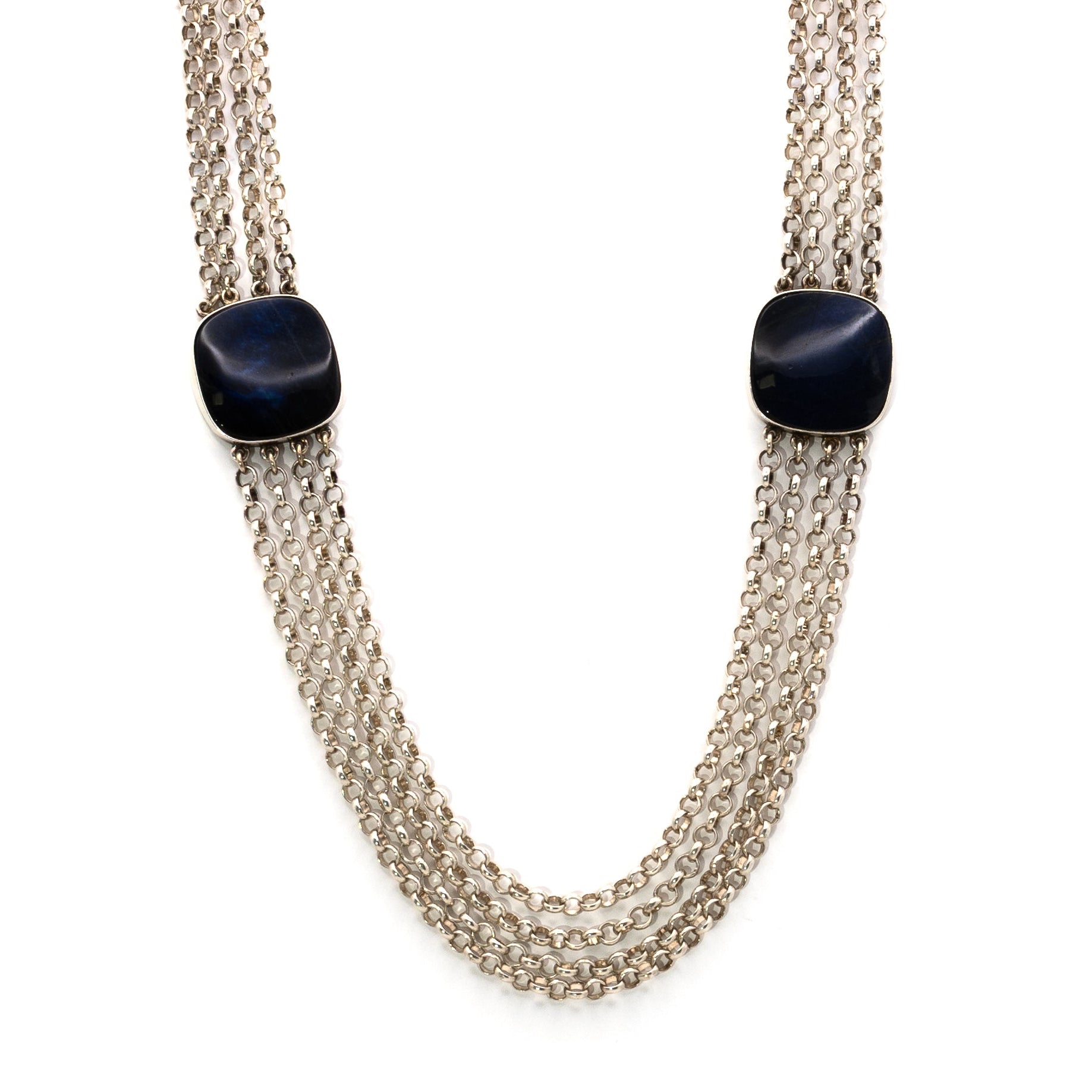 Pitkä, rohkea ja ehdottomasti kaikkea muuta kuin small talkia varten. Kaksi dramaattista mustaa jalokiveä vartioivat kaulakorun molempia puolia kuin tyylikkäät henkivartijat – koska jos aiot tehdä vaikutuksen, tee se äänekkäästi hopealla.