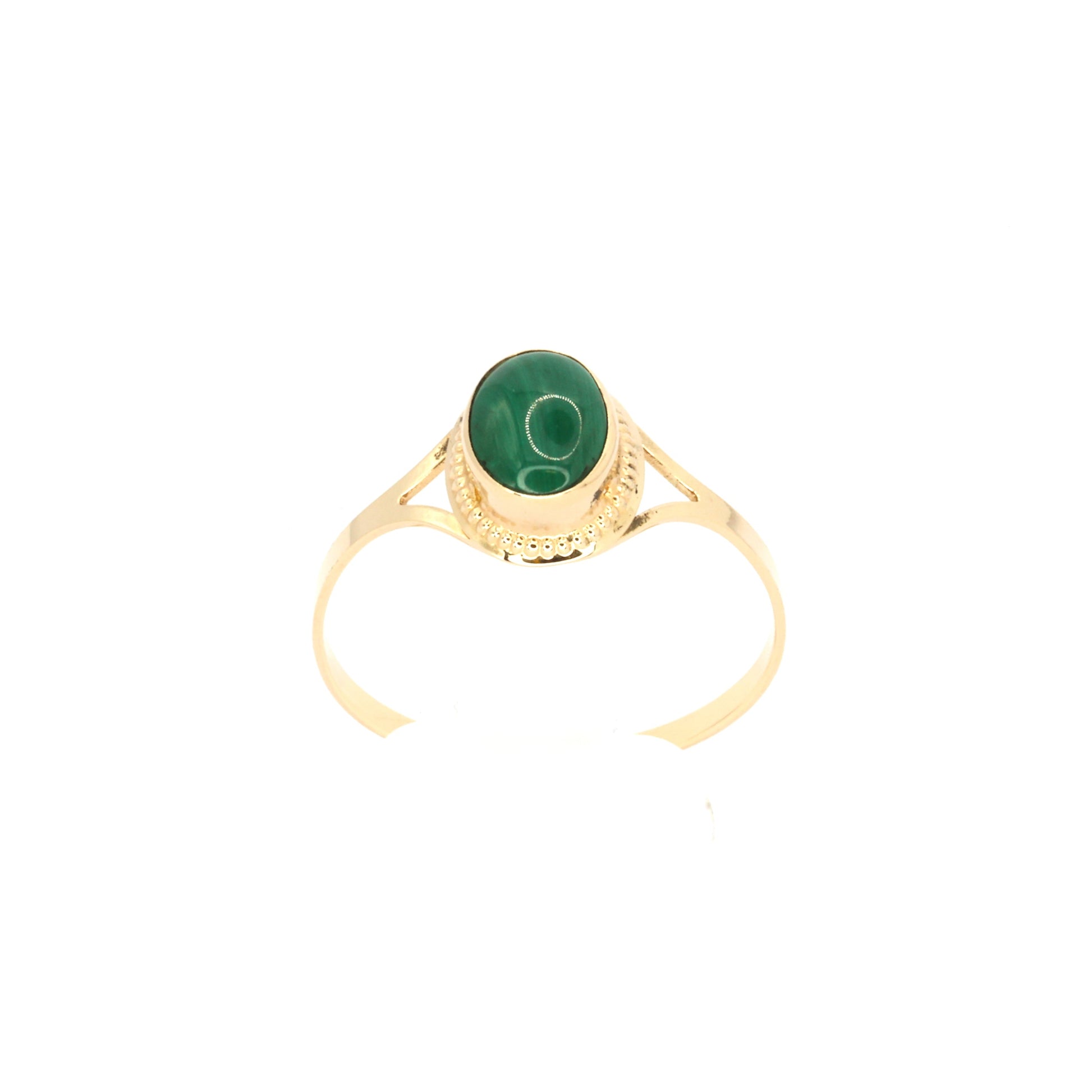 Tämä Kultasormuksessa on silmiinpistävä malakiittikivi , joka on kuuluisa rikkaasta vihreästä väristään ja lumoavista luonnollisista raidoistaan. Kuin pieni maan muovaama maisema, jokainen kivi on ainutlaatuinen.