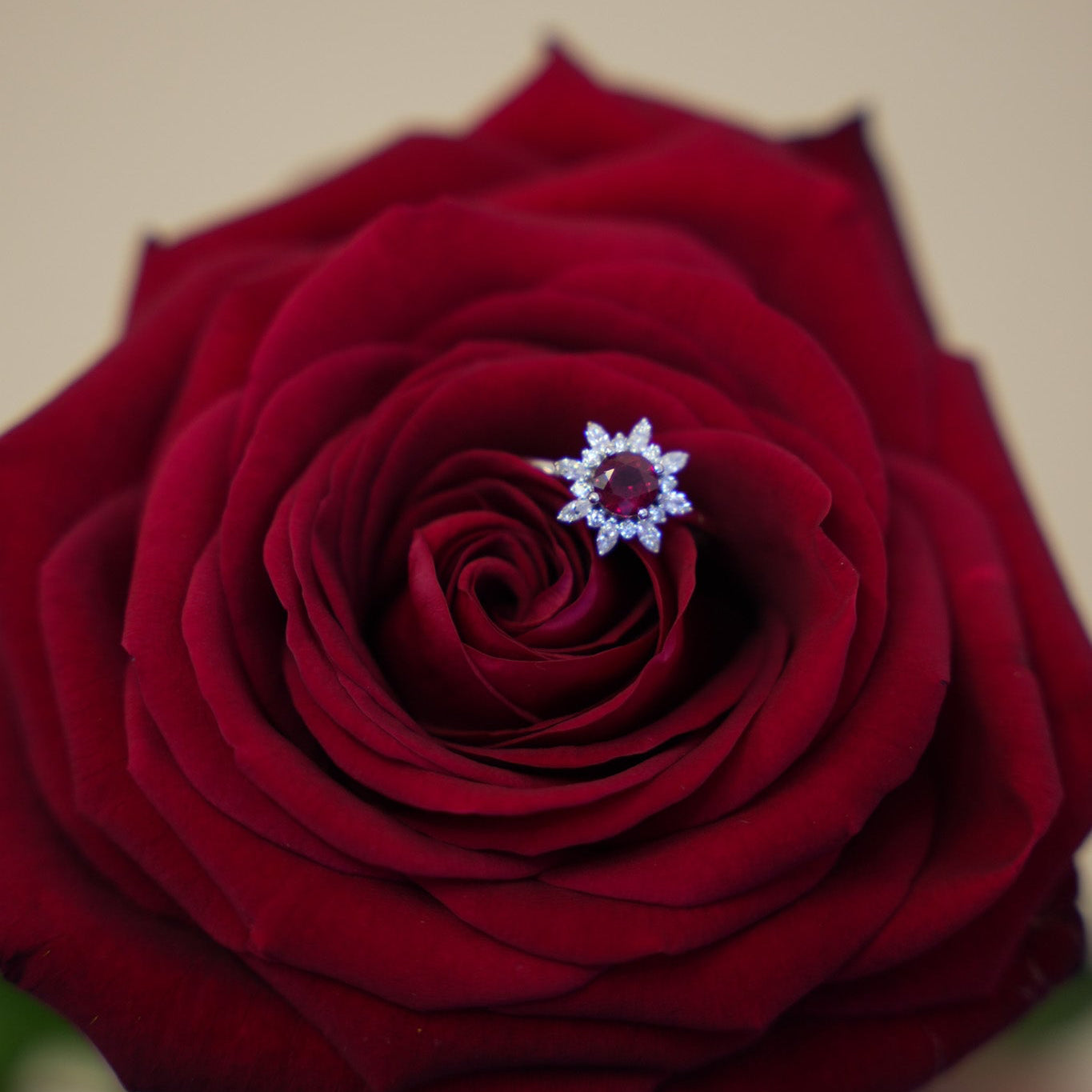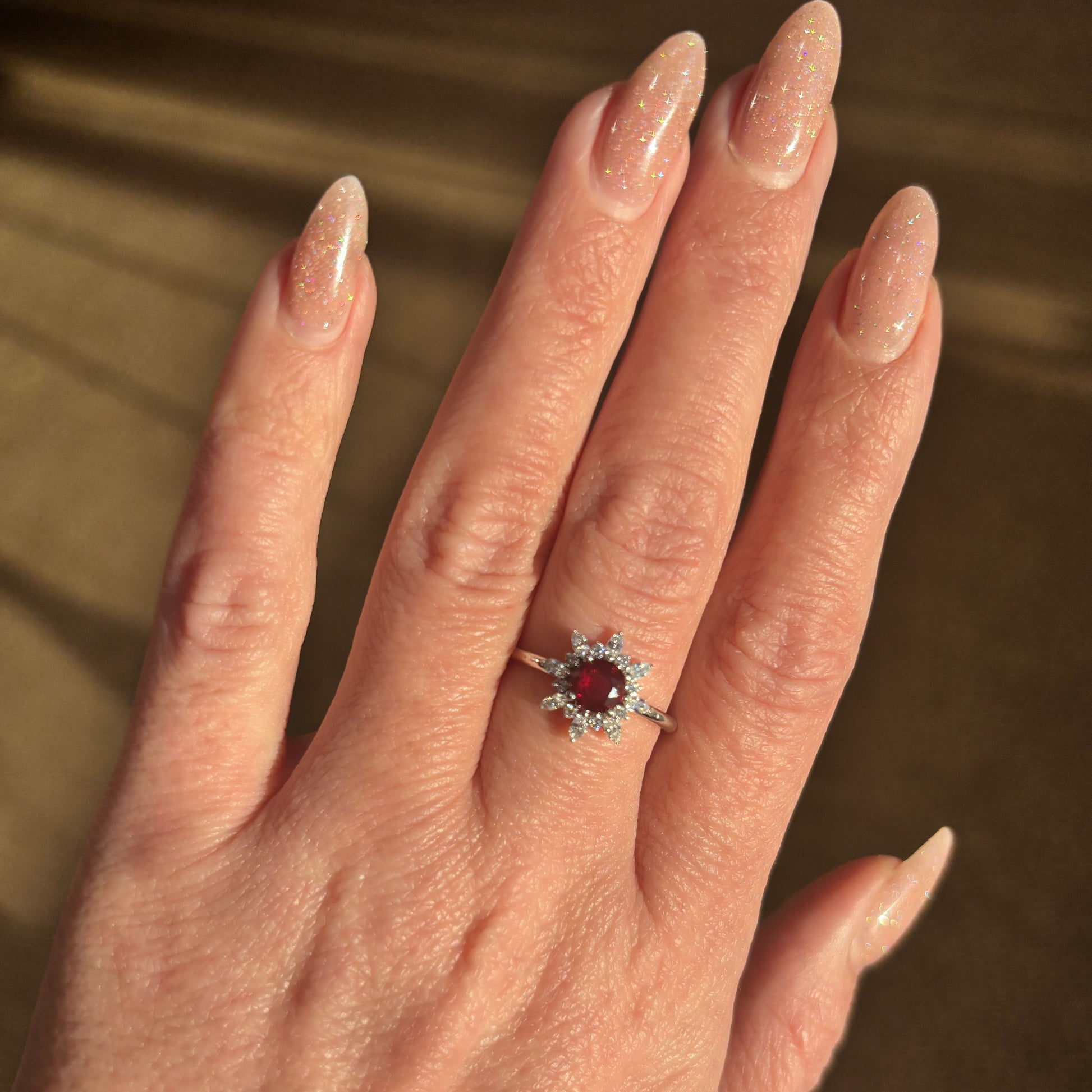 Punahehkuinen ja timanttiterävä. Tämä granaattisormus ei kuiskaa eleganssia – se huokuu sitä, ja markiisitimantit ympäröivät tulista keskustaa kuin paparazzit punaisella matolla.