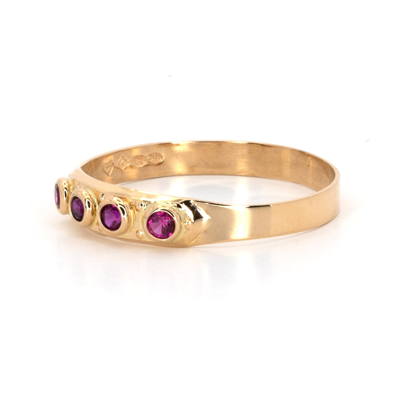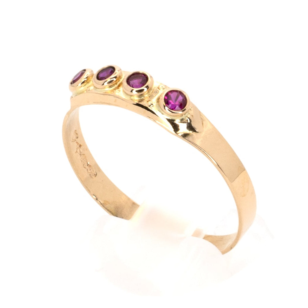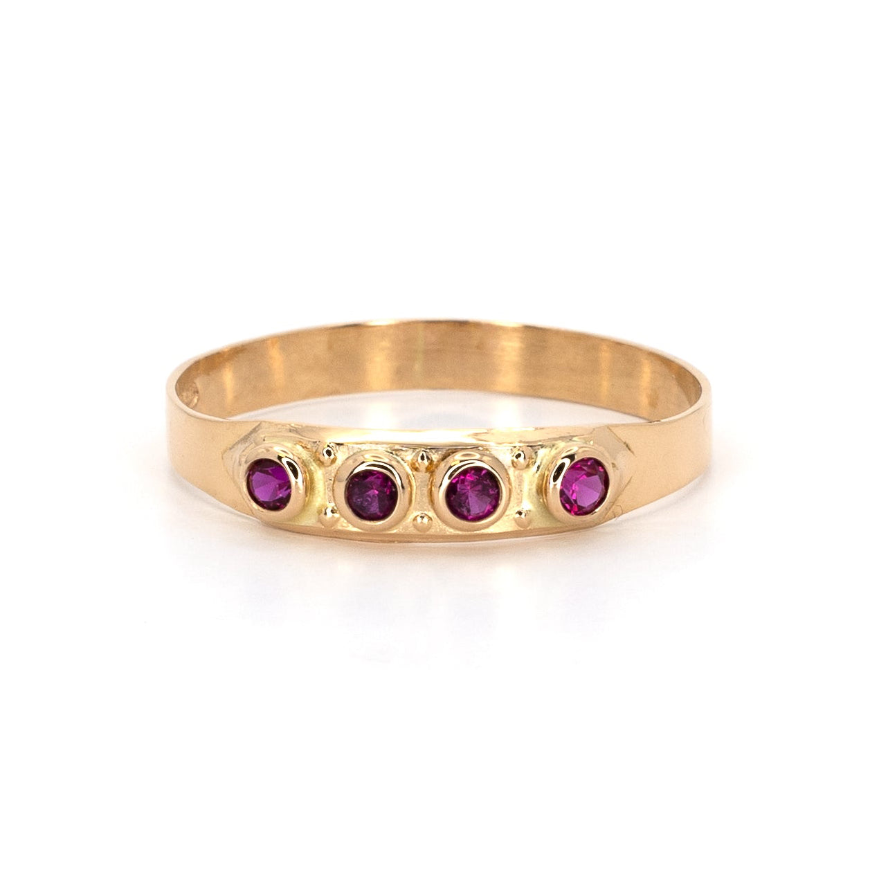 Neljä pientä synteettistä rubiinia, yksi rohkea kokonaisuus. Klassinen kultainen sormus kohtaa ripauksen tulista hohtoa – täydellinen valinta huomion herättämiseksi sytyttämättä koko maailmaa tuleen... ellet sitten halua.