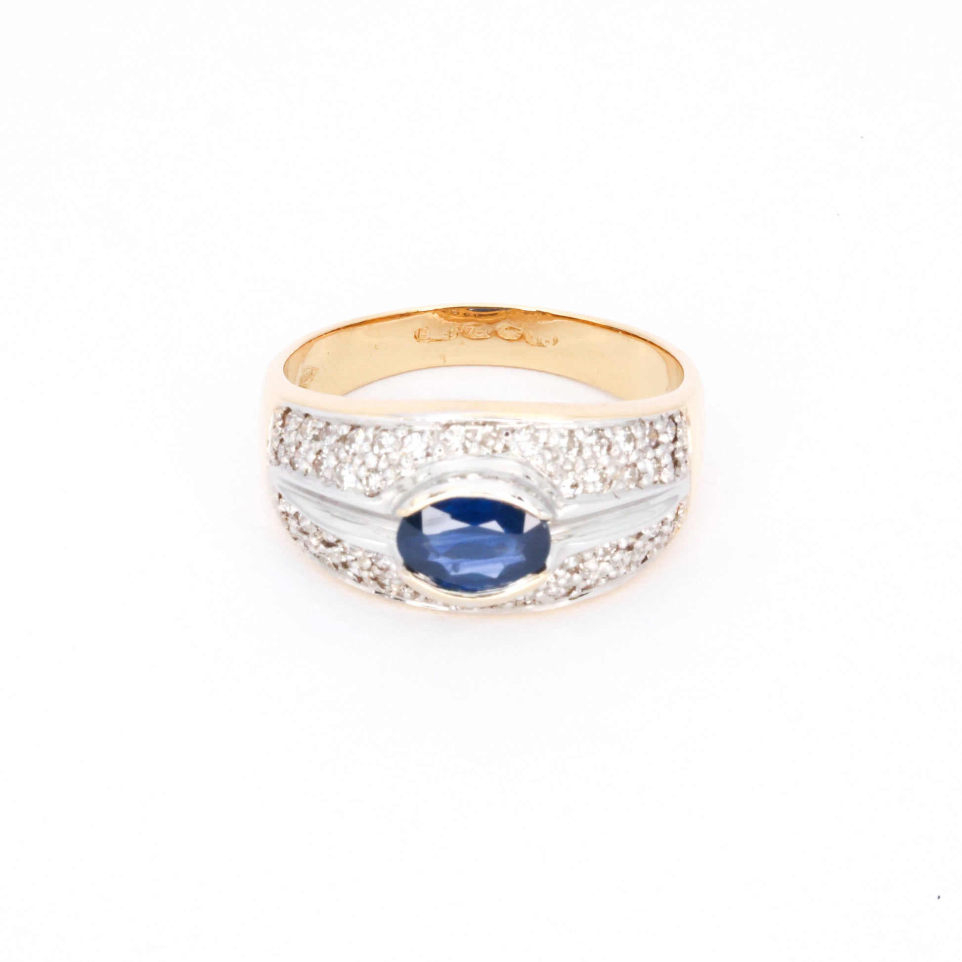 Tämä upea tummansininen safiiri on asetettu kirkkaanvalkoisten timanttien joukkoon ja puhuu puolestaan! 80-luvun retrotyylinsä ansiosta tämä on loistava lisä mihin tahansa korukokonaisuuteen.