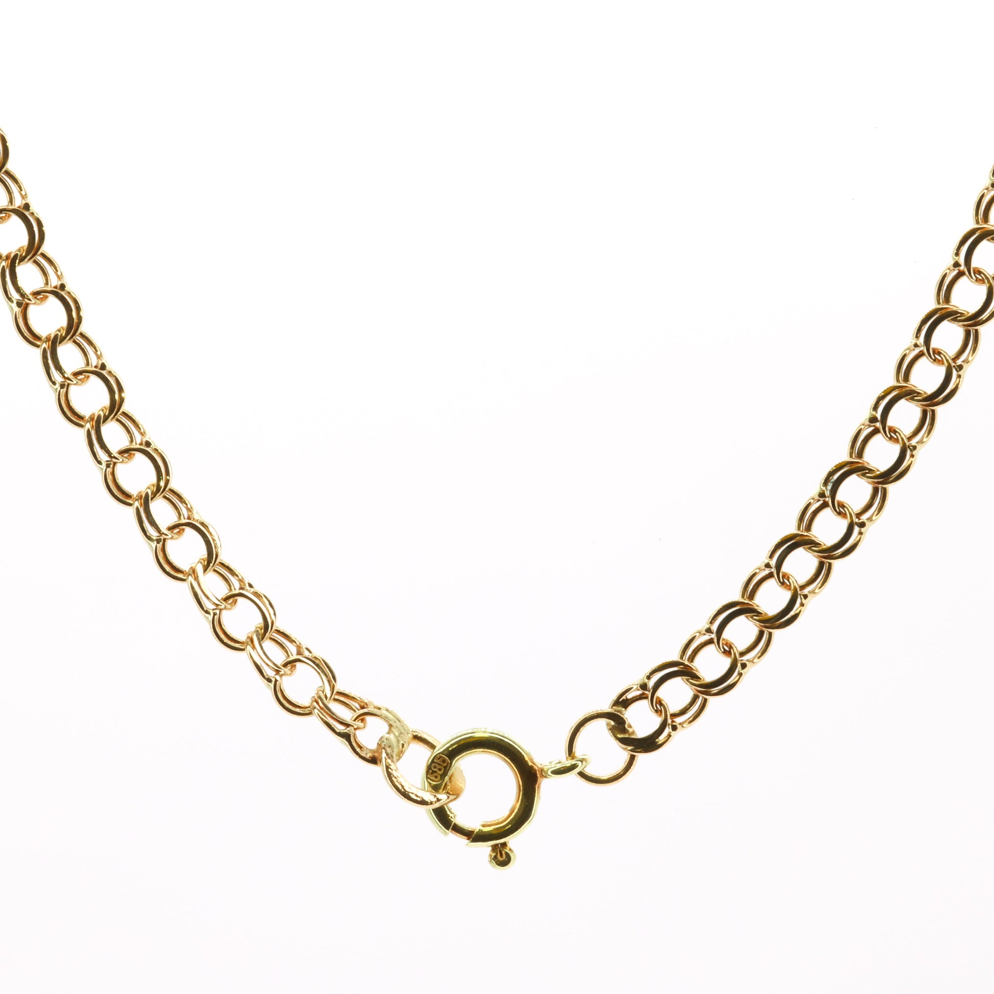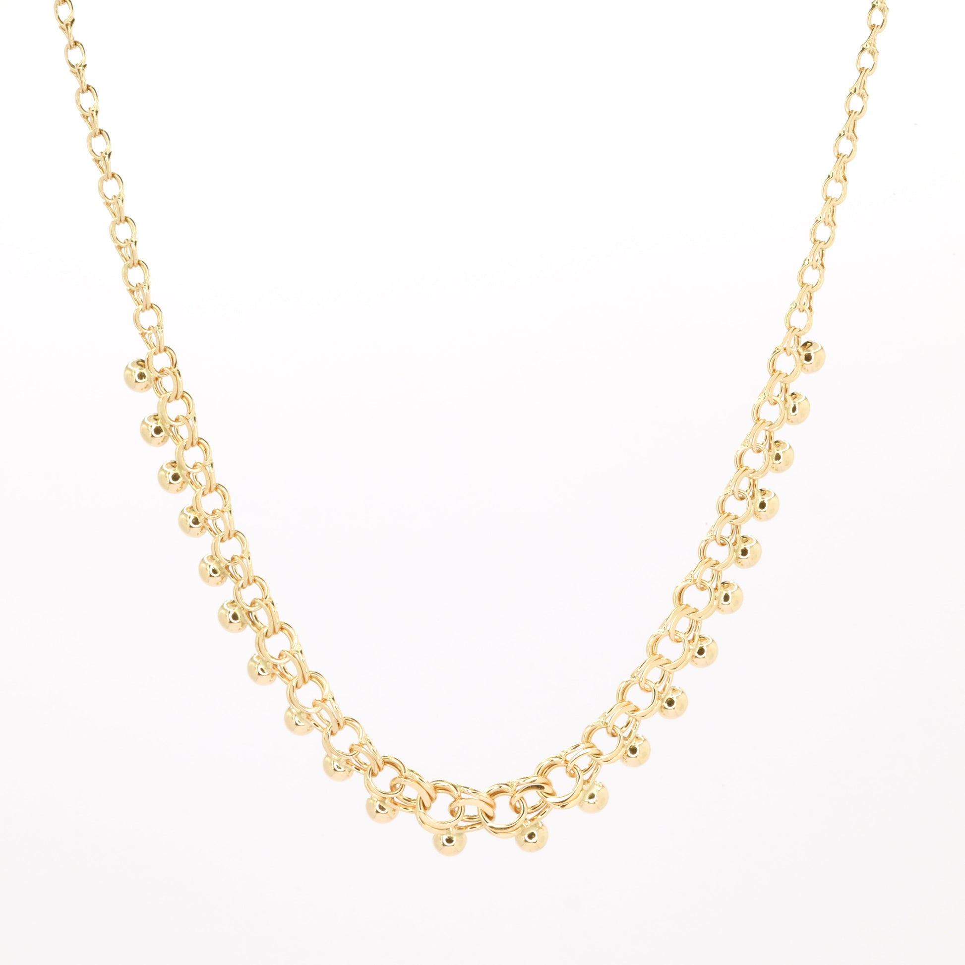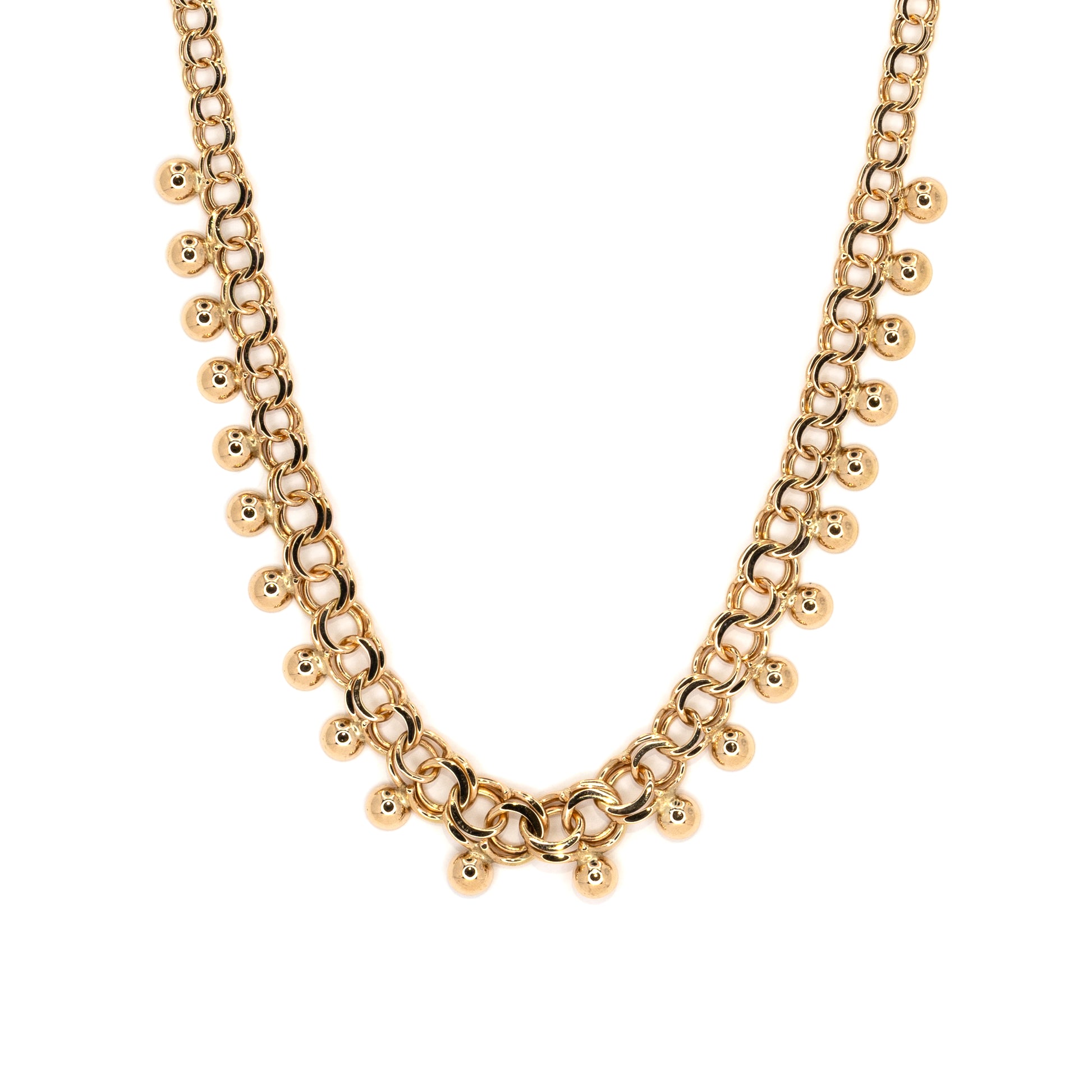 This graduated Bismarck chain doesn’t just sit pretty — it struts. Heavy gold links bring the drama, while the tiny round charms dance along like they’re at a disco.
