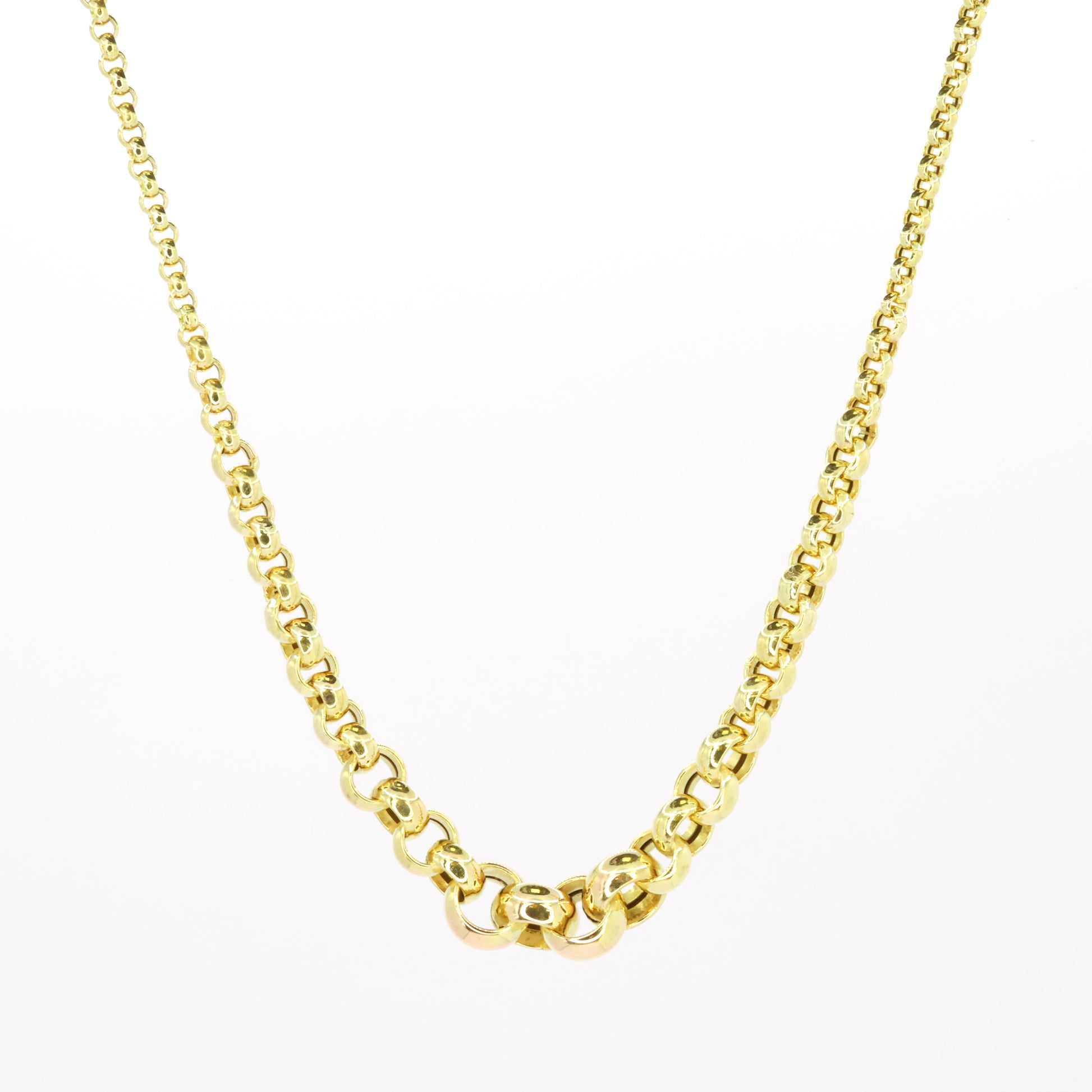 This Blecher gold chain doesn’t believe in staying the same size — it starts sleek at the back with 2.5 mm links, then grows bold and chunky in the front at a full 8 mm.