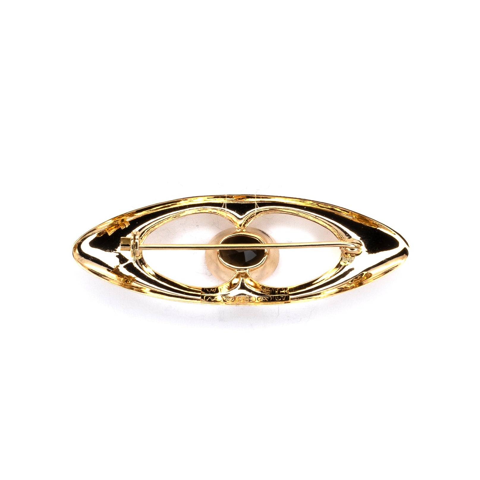 Straight from the swinging sixties, this elongated eye-shaped gold brooch by Koru-Sampo is serving golden gaze energy. With a sultry brown gemstone at its center, it looks like it’s seen a few secrets—and probably kept them, too. Pin it on your lapel and watch it command attention like a knowing wink across the room. Mid-century sophistication with a touch of mystery? Oh, absolutely.