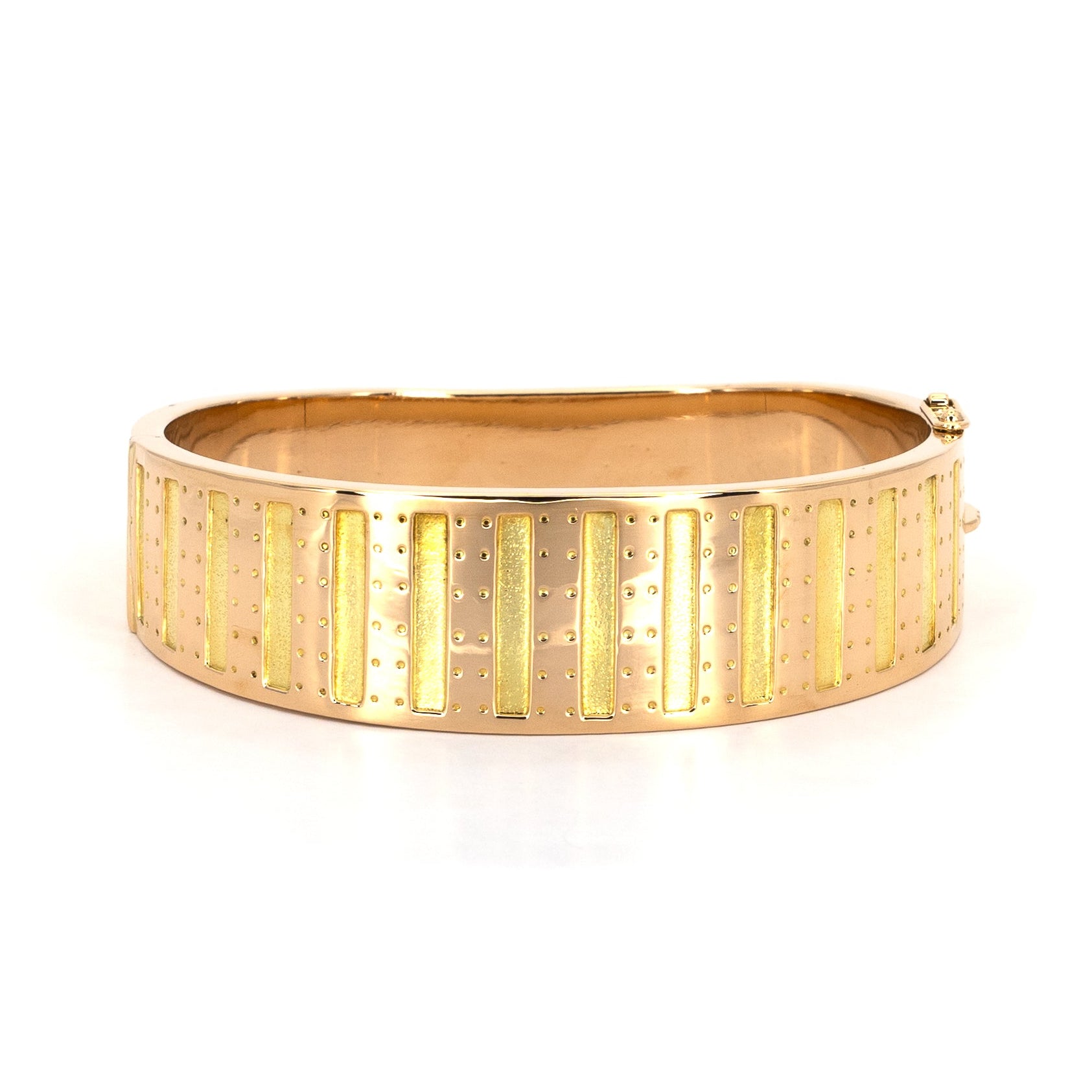 It’s wide. It’s sculptural. It sits on your wrist like it owns the place (because it kind of does). No sparkle tricks, no sweet details — just confident, historical gold with serious presence.