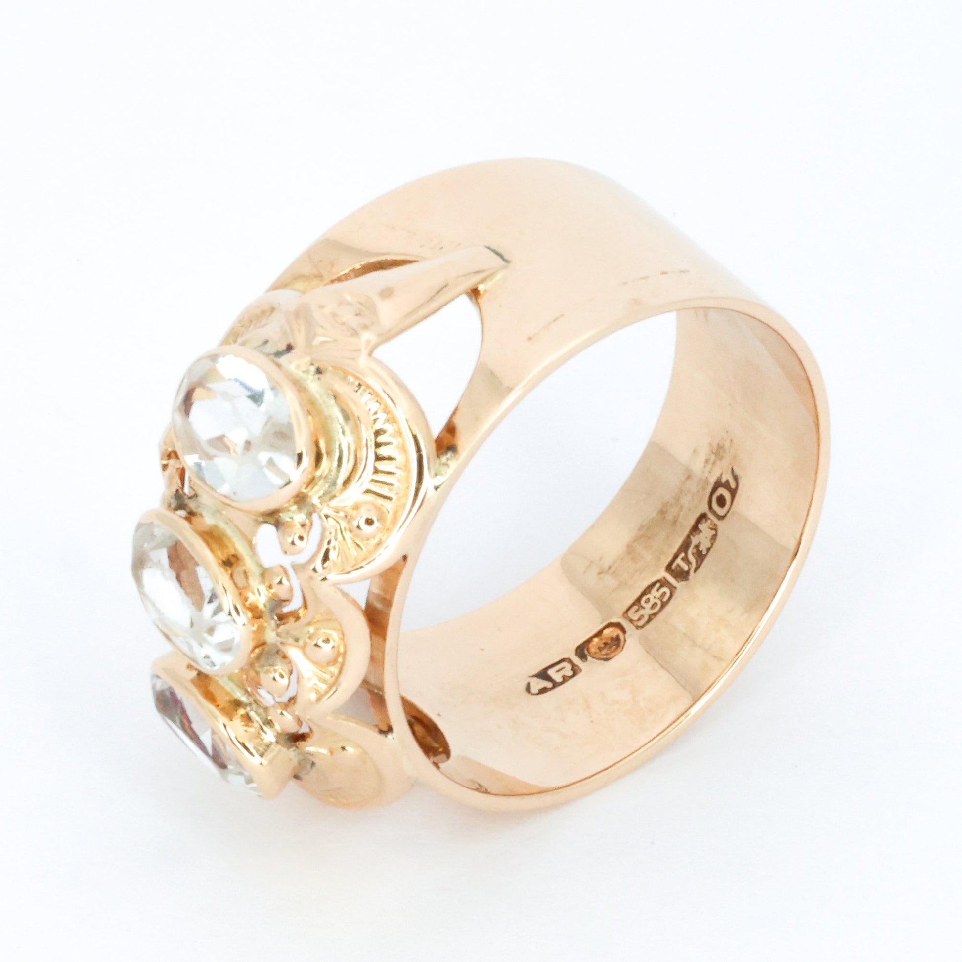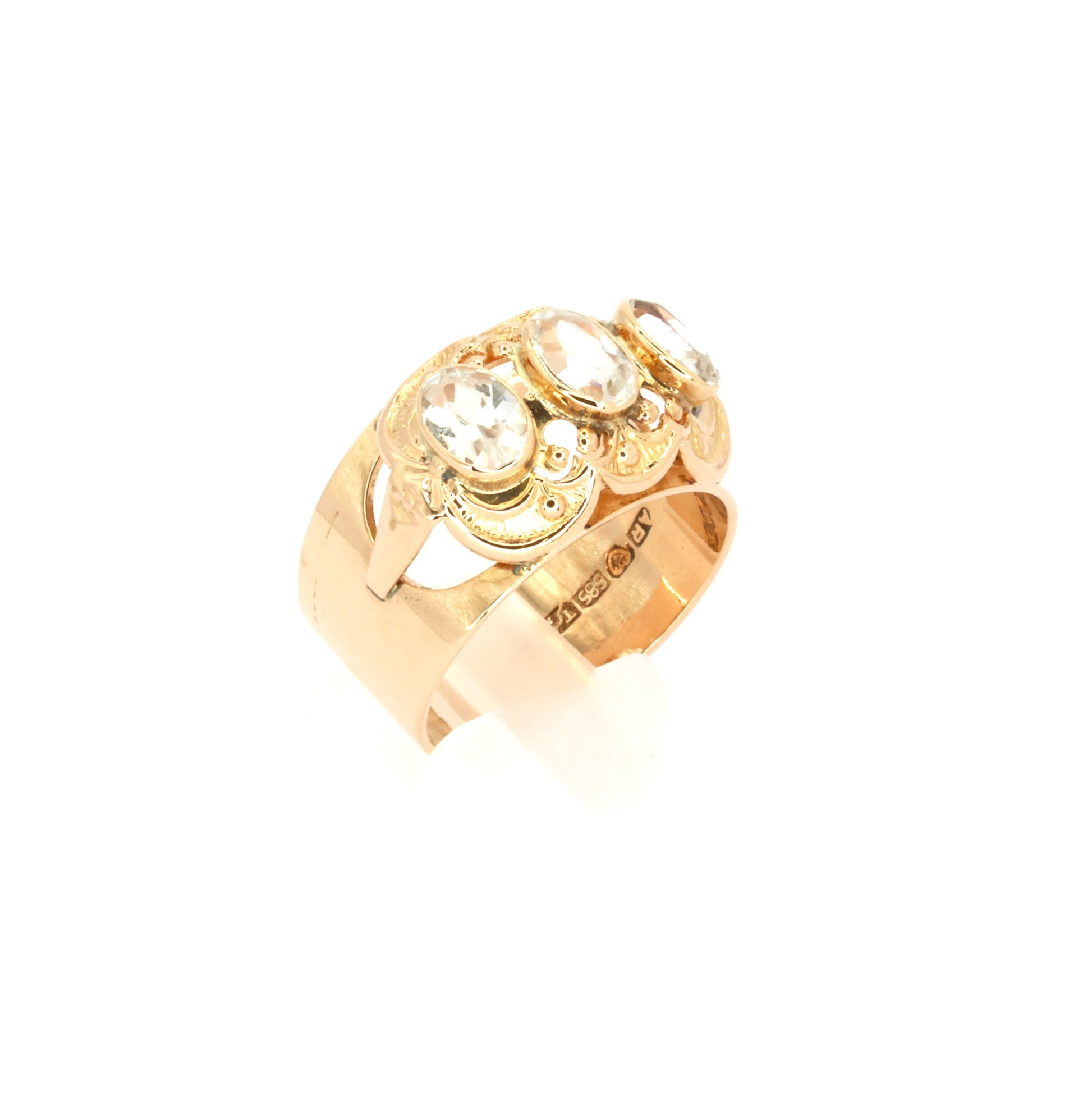 Step back into the swinging sixties with this bold 14K gold ring, crafted in 1967. Its wide band and ornate detailing are topped with sparkling stones that have seen a life well-lived. The main gemstone shows a little wear, but let’s be honest—so do most of us from the ’60s, and we’re still fabulous.